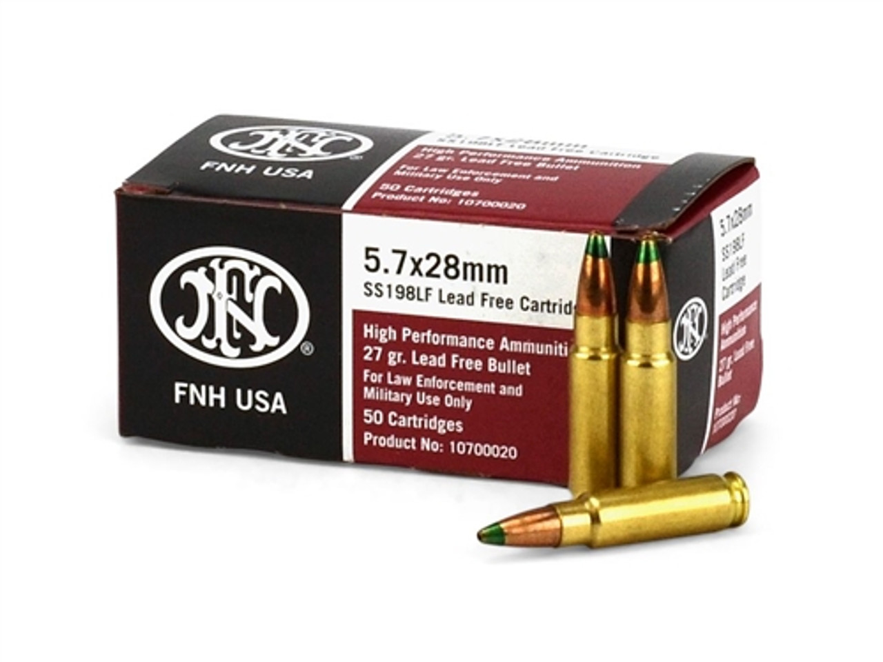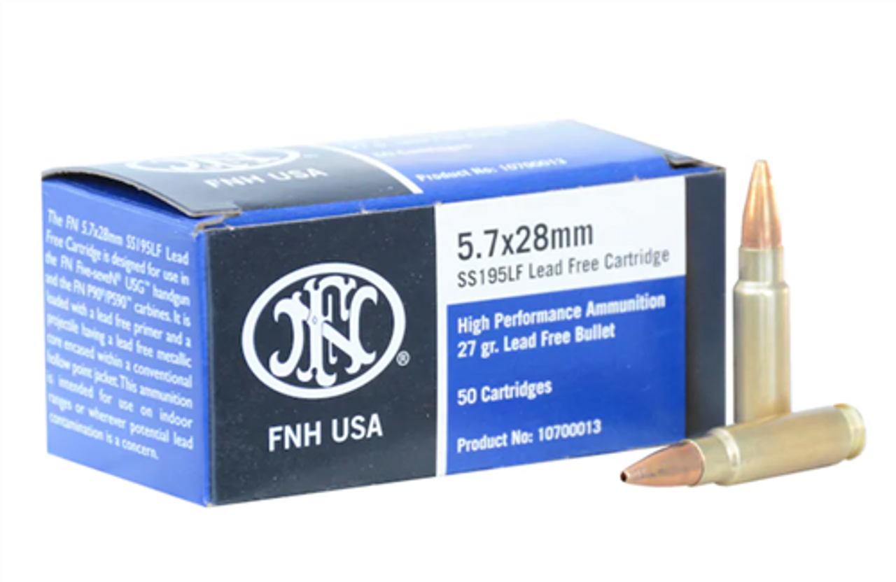 FNH SS195LF Ammunition is a lead free alternative for the 5.7x28mm round. The jacketed hollow point bullet features an aluminum core and a copper jacket for excellent weight retention while still expanding on small game. The round may be identified by the silver, lead free primer. Ballistics are similar to the SS190 round.